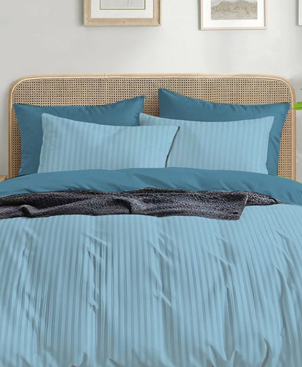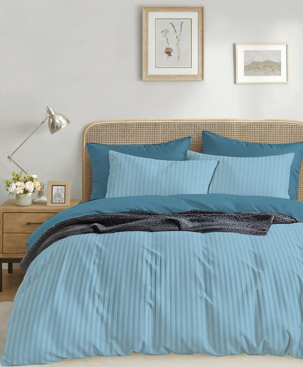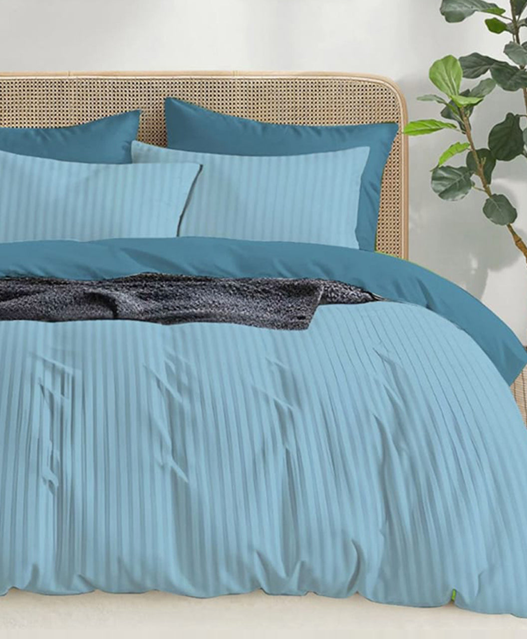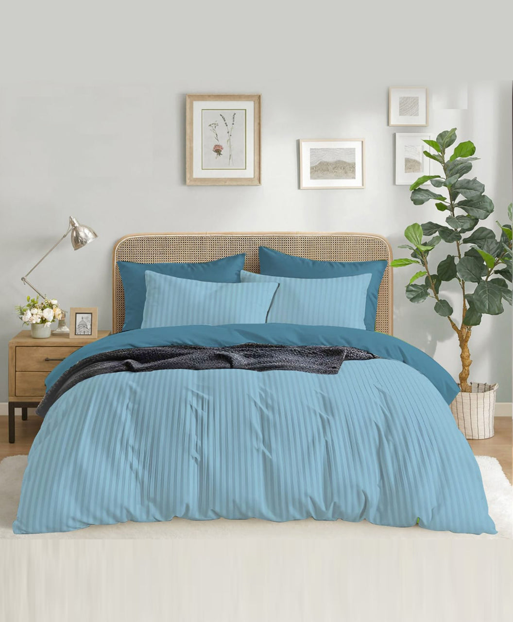 Brighten your space with this refreshing sky blue striped bedsheet set. Its vibrant yet soothing color adds a cheerful vibe, making your bedroom feel lively and full of positive energy.